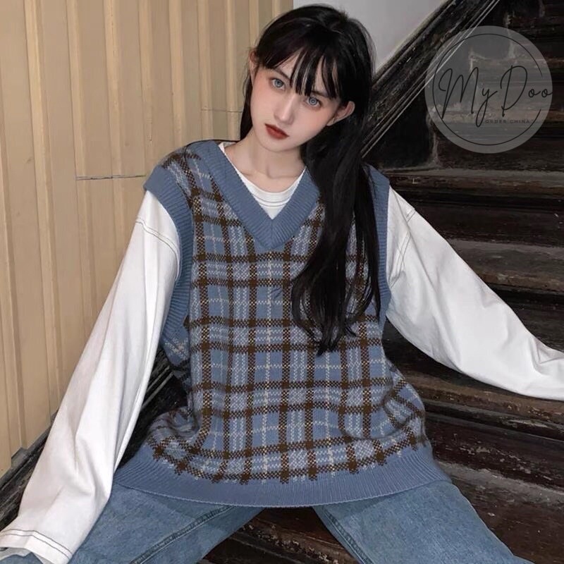 Áo Gile xanh kẻ caro ulzzang ⚡ ẢNH THẬT ⚡Set Áo ghi lê len phong cách Hàn Quốc hàng có sẵn free ship