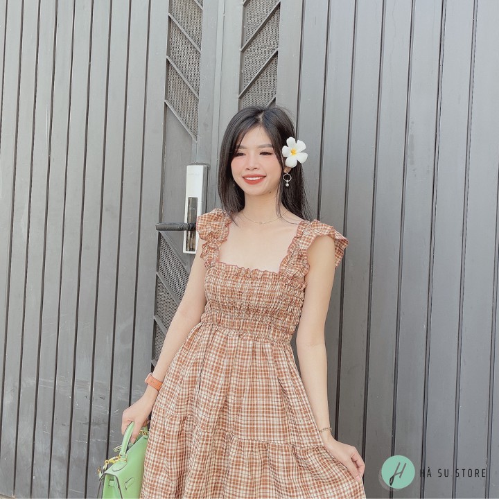 [HOT] Váy Đầm Kẻ Sọc Caro 2 (hai) Dây Bản To Dáng Dài, Chun Ngực free ship